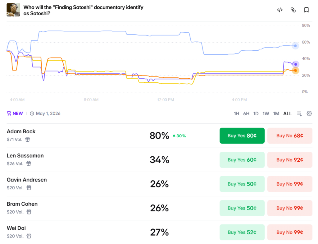 ขณะที่ภาพยนตร์เปิดให้สั่งซื้อล่วงหน้าผ่าน FindingSatoshi.com ตลาดทำนายผลชื่อดังอย่าง Polymarket ได้เปิดพูลเดิมพันตัวตนผู้สร้าง Bitcoin ที่จะถูกเปิดเผยในสารคดีวันที่ 22 เม.ย.นี้