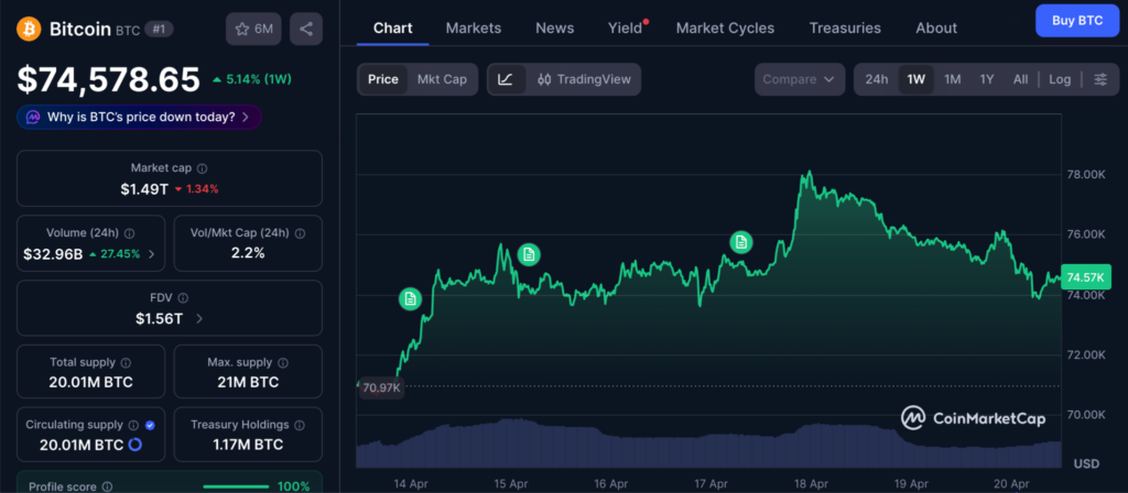 ปัจจุบันราคาบิทคอยน์ซื้อขายอยู่ที่ประมาณ 74,703 ดอลลาร์ ราคาเพิ่มขึ้น 5.14 % ภายในรอบสัปดาห์ที่ผ่านมา