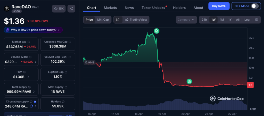 ความผันผวนของตลาดคริปโตเคอร์เรนซีสำแดงเดชให้เห็นอีกครั้ง กับกรณีของ RaveDAO ที่ราคาดิ่งนรกจาก 27 ดอลลาร์ ลงมาต่ำกว่า 1 ดอลลาร์ ภายในเวลาไม่ถึง 24 ชั่วโมง มูลค่าตลาดที่เคยสูงถึง 7 พันล้านดอลลาร์หดตัวเหลือเพียง 200 ล้านดอลลาร์ในพริบตา เหตุการณ์นี้กลายเป็นจุดชนวนสำคัญ ที่ทำให้นักลงทุนเริ่มหวาดระแวงว่า คริปโตเหรียญไหนจะกลายเป็นเหยื่อรายต่อไป