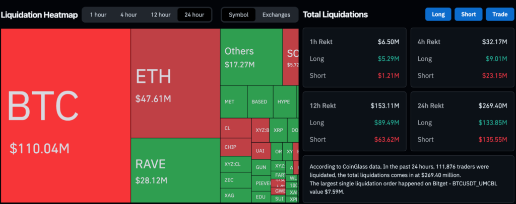 - สิ่งที่น่าสนใจคือตัวเลขความเสียหายของฝั่ง Long 133 ล้านดอลลาร์ และ Short 135 ล้านดอลลาร์ มีมูลค่าแทบจะเท่ากัน สะท้อนถึงการกวาดทั้งสองฝั่งแบบมีนัยสำคัญ