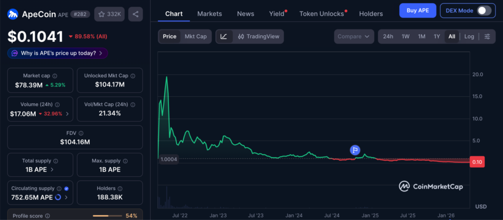 - Floor Price ของคอลเลกชันมูลค่าดิ่งลง 94.3% จากจุดสูงสุด ขณะที่เหรียญ ApeCoin (APE) ราคาร่วงหนักถึง 99.6% แม้จะมีการเปลี่ยนตัว CEO เป็น Michael Figge เพื่อพยายามกู้สถานการณ์ผ่านโปรเจกต์ Metaverse อย่าง Otherside แต่ดูเหมือนเงินลงทุนใหม่จะยังไม่ไหลเข้าตลาดนี้เลย