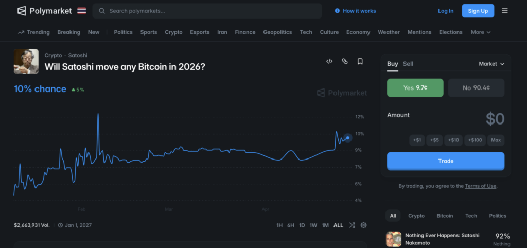 - กระแสดังกล่าวดันให้นักเก็งกำไรบน Polymarket เชื่อว่าโอกาสที่เหรียญของ Satoshi จะเกิดการเคลื่อนย้ายในอนาคตพุ่งทะยานแตะระดับ 10%