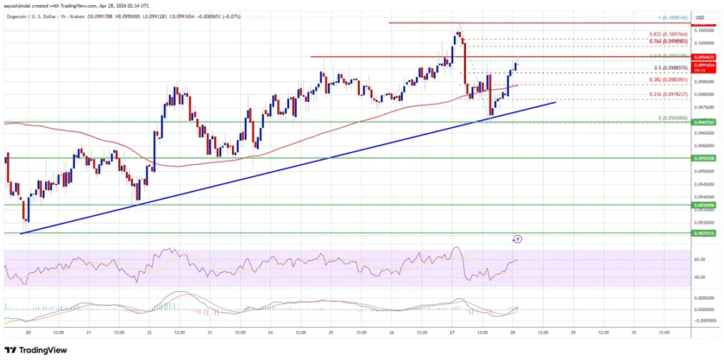ราคา DOGE สามารถเบรกทะลุแนวต้าน 0.0980 และ 0.0985 ดอลลาร์ขึ้นมาได้ด้วยความมั่นใจในระดับปานกลาง การเคลื่อนไหวของราคายังสามารถทะลุผ่านระดับ Fibonacci retracement 50% ของรอบการร่วงลงก่อนหน้าจาก 0.1008 ไปยัง 0.0969 ดอลลาร์ ปัจจุบันเหรียญกำลังเทรดอยู่เหนือระดับ 0.0970 ดอลลาร์และเส้นค่าเฉลี่ย 100 ชั่วโมง ซึ่งการรวมกันของปัจจัยเหล่านี้ถือเป็นสัญญาณที่บ่งบอกถึงโมเมนตัมกระทิงในระยะสั้น