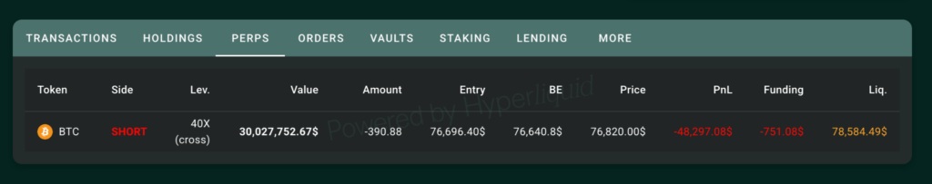 อ้างอิงข้อมูลจาก hypurrscan tracker ที่ใช้ในการติดตามข้อมูล พบว่าเจ้ามือรายนี้ได้ทำการเปิดชอร์ต Bitcoin 390 BTC เป็นมูลค่ากว่า $29,982,410 (~972 ล้านบาท) พร้อมด้วยเลเวอเรจที่สูงถึง 40X